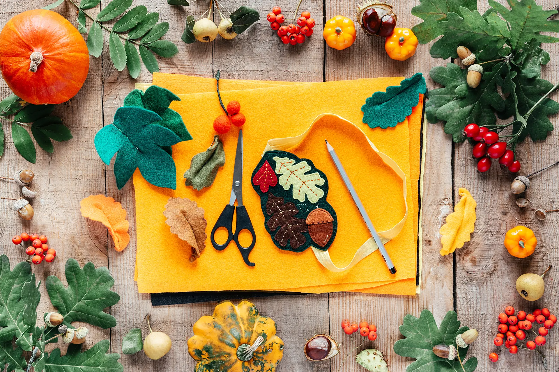 Κόψιμο σχημάτων (φύλλα, κολοκύθες): Επιλέξτε τσόχα ή βαμβακερό ύφασμα και κόψτε μικρά σχήματα, όπως φύλλα, κολοκύθες ή βελανίδια. Για πιο τρισδιάστατο αποτέλεσμα, μπορείτε να τα γεμίσετε με λίγη γέμιση μαξιλαριού πριν τα κλείσετε με ραφή. Μετατροπή σε γιρλάντες ή mobile: Περάστε τα σχήματα με βελόνα σε σπάγκο ή χοντρή κλωστή για να δημιουργήσετε γιρλάντα. Κρεμάστε τα από ξύλινο κύκλο ή κλαδί για να φτιάξετε mobile που θα διακοσμεί παράθυρο ή παιδικό δωμάτιο. Χρησιμοποιήστε εναλλαγή χρωμάτων και μεγεθών για πιο ζωντανή σύνθεση.