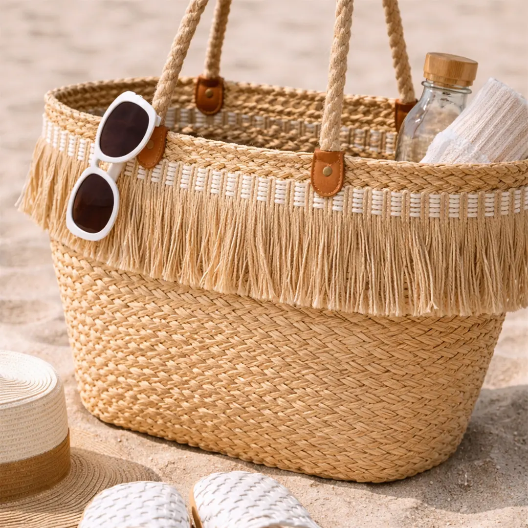 Διακοσμητικό κρόσσι από ψάθα σε φυσική μπεζ απόχρωση, ιδανικό για χειροποίητες τσάντες, ψάθινα καλάθια, καπέλα, μαξιλάρια, διακοσμητικά είδη και DIY κατασκευές.