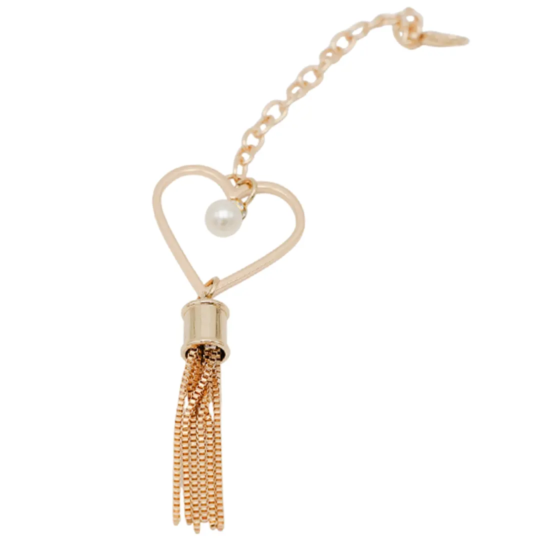 Μπρελόκ τσάντας με σχέδιο καρδιά, λευκή πέρλα και μεταλλική φούντα, σε χρυσό ή ασημί χρώμα και μήκος 22cm που προσφέρει κομψή και εντυπωσιακή εμφάνιση.