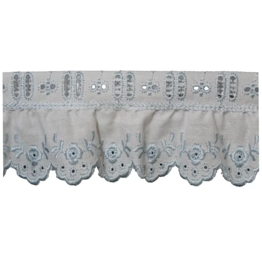 Αυτή η δαντέλα ασπροκέντημα συνδυάζει κλασική λευκή βάση με διακριτικό φλοράλ κέντημα και κυματιστό τελείωμα που χαρίζει ρομαντικό αποτέλεσμα.