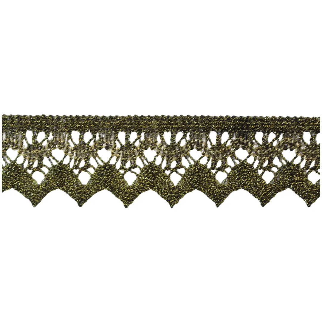 Δαντέλα λασέ με διάτρητο μοτίβο και μυτερό τελείωμα, κατάλληλη για τοποθέτηση σε κεντήματα τραπεζομάντηλων και εκκλησιαστικών ειδών. Διατίθεται σε μπρονζέ με χρυσό, μπρονζέ με μπορντό, χρυσό ανοιχτό και χρυσό μεσαίο.