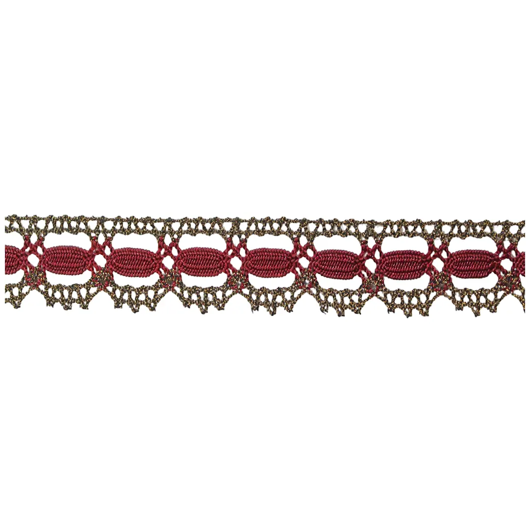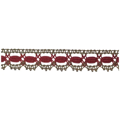 Δαντέλα λασέ σε χάλκινη απόχρωση με κεντρικό μπορντό οβάλ σχέδιο. Τοποθετείται σε κεντήματα τραπεζομάντηλων και εκκλησιαστικών υφασμάτων, προσφέροντας έντονη διχρωμία και επιβλητικό τελείωμα.
