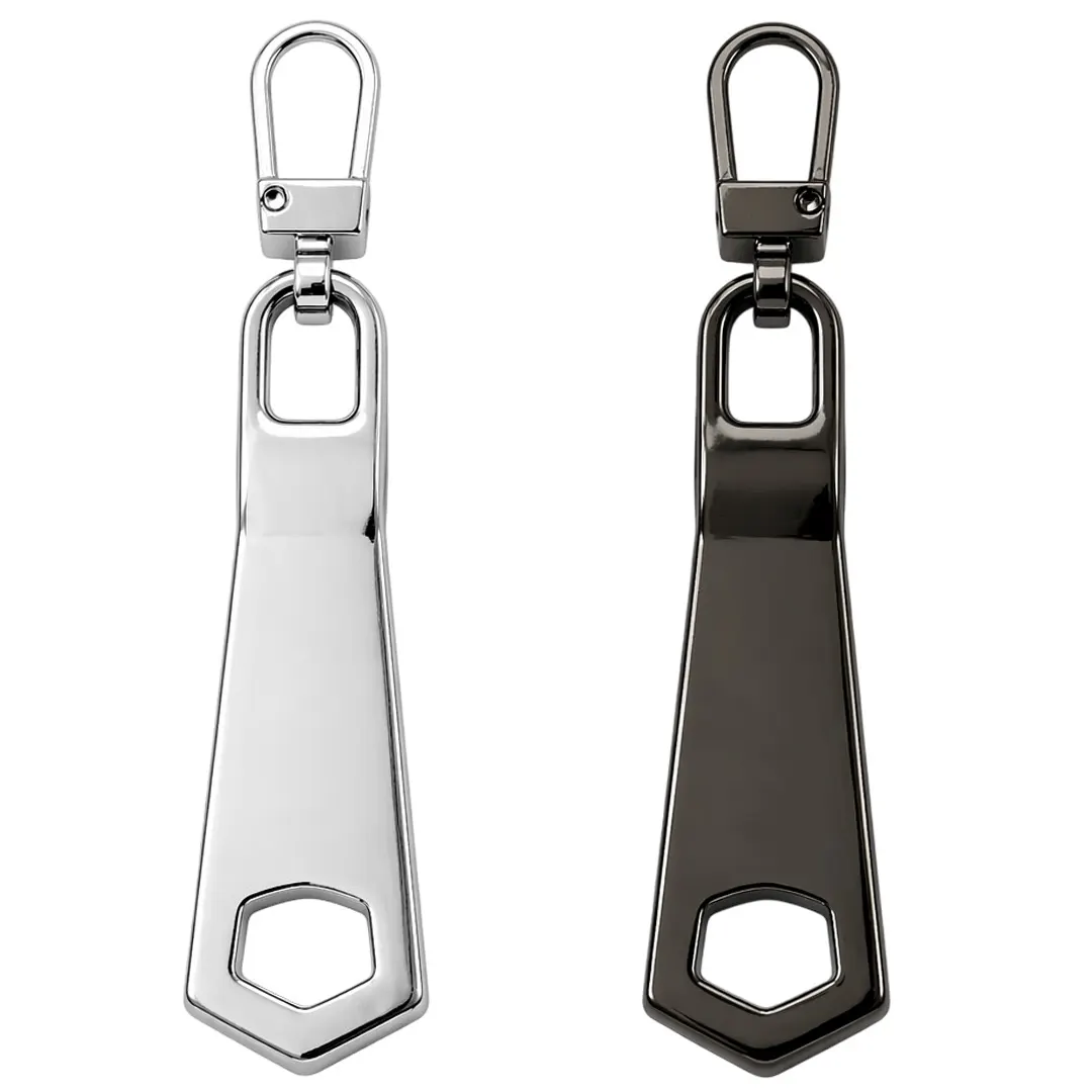 Το μεταλλικό γαντζάκι φερμουάρ σε γεωμετρικό σχήμα με διακριτικό άνοιγμα στο κάτω μέρος αποτελεί μία μοντέρνα και πρακτική επιλογή για κάθε τύπο φερμουάρ.