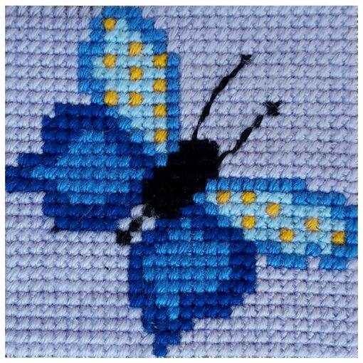Μια μπλε πεταλούδα ξεδιπλώνει τα φτερά της μέσα από το κέντημα, περιμένοντας τα χέρια ενός παιδιού να της δώσουν ζωή. Το σχέδιο είναι τυπωμένο πάνω σε καμβά σμύρνα με μεγάλες τρύπες, που καθιστά το πέρασμα της βελόνας εύκολο και άνετο, ιδανικό για την πρώτη επαφή των παιδιών με το κέντημα.
