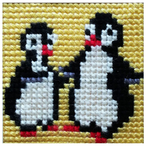 Το σταμπωτό καδράκι με τους παιχνιδιάρικους πιγκουίνους είναι μια υπέροχη πρόταση για μικρούς αρχάριους που θέλουν να ξεκινήσουν την πρώτη τους εμπειρία με το κέντημα.