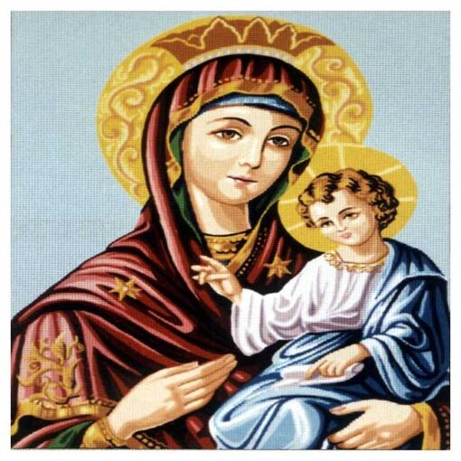 Το σταμπωτό κέντημα Η Παναγία απεικονίζει τη μορφή της Παναγίας με το Θείο Βρέφος, αποδίδοντας την τρυφερότητα και τη θρησκευτική κατάνυξη της εικόνας με εντυπωσιακή λεπτομέρεια. Τυπωμένο σε καμβά Νο7, το σχέδιο είναι έτοιμο για σταυροβελονιά ή κομπλέν, χρησιμοποιώντας DMC mouline σε τρίκλωνες κλωστές για πλούσια υφή και άριστη κάλυψη. Ιδανικό για όσους θέλουν να δημιουργήσουν ένα μοναδικό χειροποίητο έργο τέχνης, που θα κοσμήσει κάθε χώρο με πνευματικότητα και αισθητική αρτιότητα.