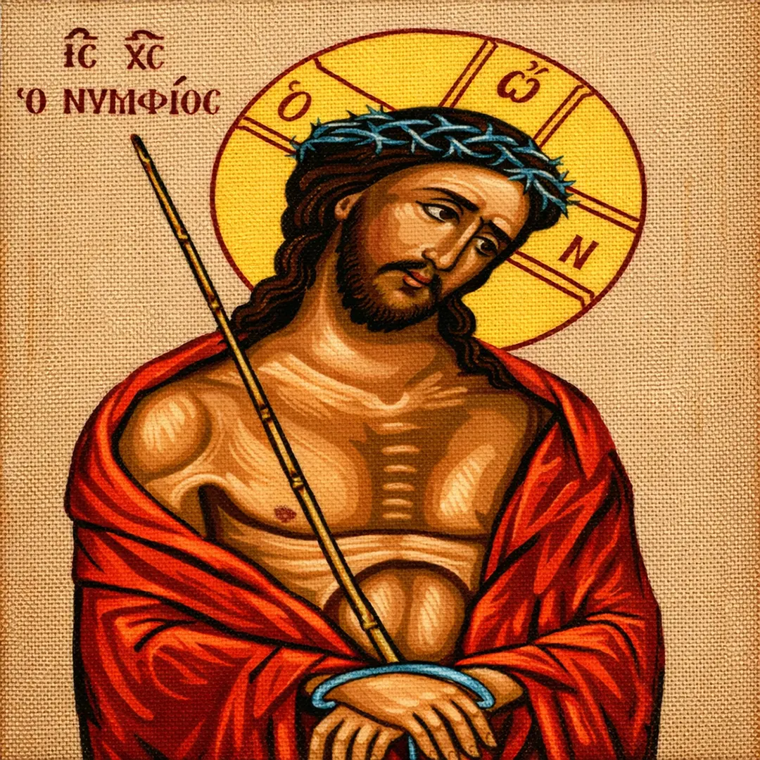 Κέντημα σταμπαριστό για σταυροβελονιά σε εταμίν ύφασμα Κνωσσός μπεζ με χρυσό, με παράσταση του Ιησού Ο Νυμφίος σε κλασική βυζαντινή απεικόνιση. Το σχέδιο είναι τυπωμένο επάνω στο ύφασμα με καθαρές γραμμές και σωστή χρωματική καθοδήγηση, ώστε να διευκολύνει την εργασία στη σταυροβελονιά και να αποδίδονται με ακρίβεια οι λεπτομέρειες του προσώπου και του ενδύματος.
