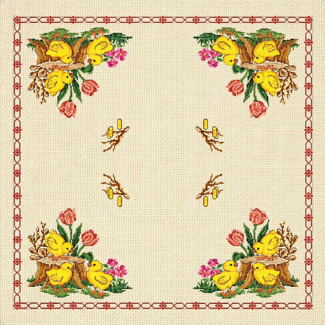 Σταμπωτό κέντημα καρέ σε εταμίν ύφασμα Κνωσσός μπεζ με χρυσές λεπτομέρειες, ιδανικό για κέντημα σταυροβελονιάς. Έτοιμο τυπωμένο σχέδιο για να στολίσετε τις ανοιξιάτικες ημέρες του Πάσχα.
