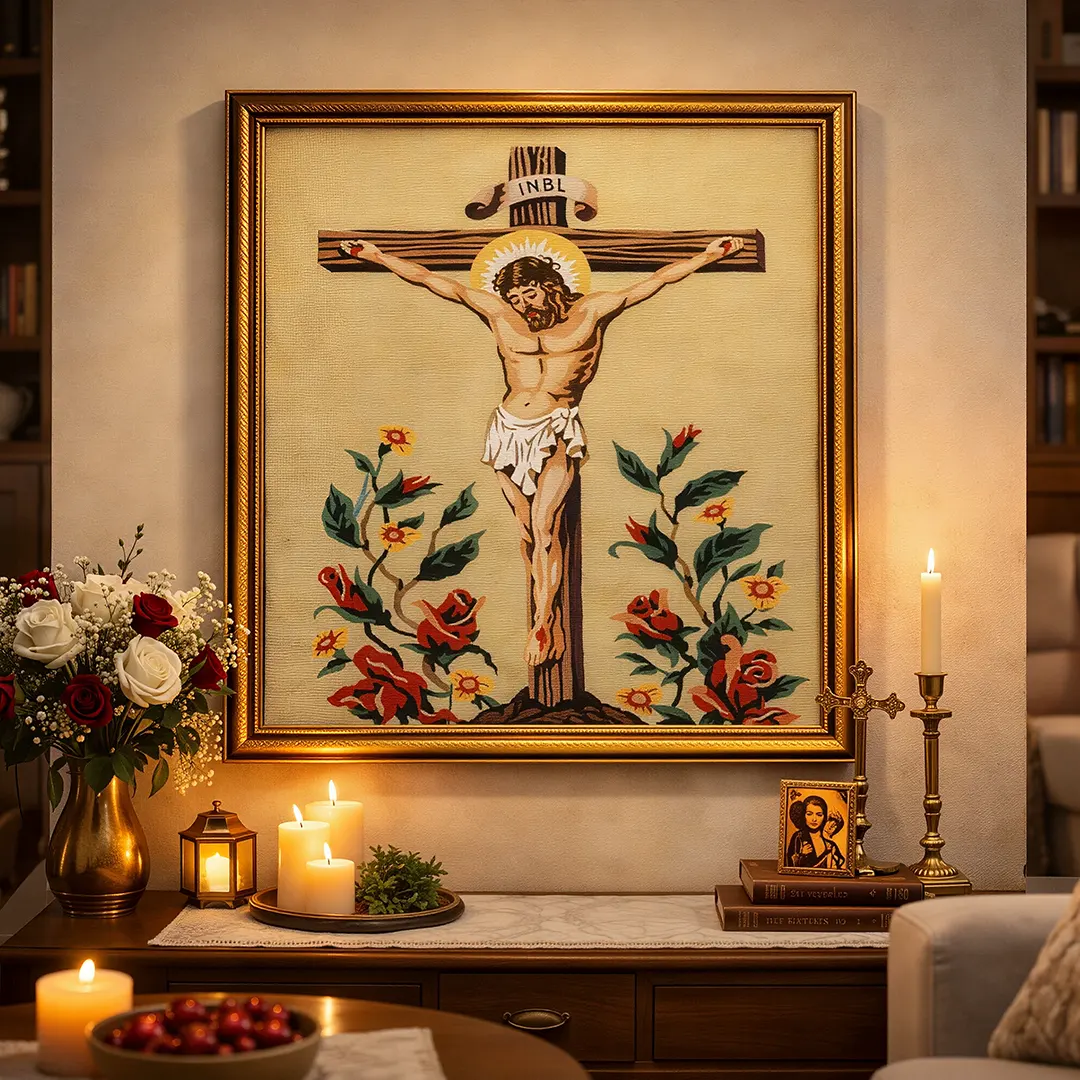 Το σταμπωτό κέντημα Ο Εσταυρωμένος αποτυπώνει με σεβασμό και λεπτομέρεια τη συγκινητική εικόνα της Σταύρωσης του Χριστού, πλαισιωμένη από τριαντάφυλλα που συμβολίζουν την αγάπη και τη θυσία. Τυπωμένο σε καμβά Νο7, το σχέδιο συνδυάζεται ιδανικά με κλωστές DMC mouline σε τρίκλωνες, εξασφαλίζοντας πλούσιο χρώμα και ανθεκτικότητα. Ιδανικό για όσους επιθυμούν να δημιουργήσουν ένα χειροποίητο έργο με βαθύ θρησκευτικό νόημα, είτε για προσωπική χρήση είτε ως πολύτιμο δώρο.