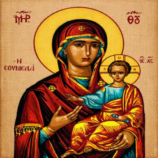 Το εταμίν Κνωσσός μπεζ διαθέτει σταθερή και ομοιόμορφη ύφανση, κατάλληλη για εκκλησιαστικά κεντήματα με λεπτομέρεια και βάθος. Η διακριτική χρυσή απόχρωση του φόντου αναδεικνύει τη μορφή της Παναγίας και του Θείου Βρέφους, προσφέροντας λαμπρότητα στο τελικό κεντημένο έργο.