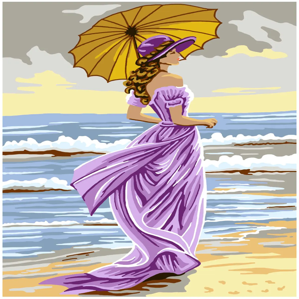 Ένα εντυπωσιακό σχέδιο για κέντημα που αποτυπώνει την κομψότητα μιας γυναίκας με μωβ φόρεμα στην ακροθαλασσιά, ιδανικό για όσους αγαπούν την τέχνη του κεντήματος. Ο λευκός καμβάς με την στάμπα καθοδηγεί το κέντημα, κάνοντας τη διαδικασία πιο εύκολη και ευχάριστη, ακόμη και για αρχάριους, ενώ το τελικό αποτέλεσμα μετατρέπεται σε μοναδικό έργο τέχνης για τον χώρο σας.
