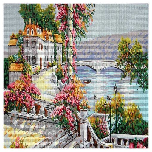 Το σταμπωτό κέντημα με το θαλασσινό χωριό με λουλούδια και πέτρινο γεφύρι αποτυπώνει μια ονειρική ακτογραμμή γεμάτη ζωή και χρώμα. Παραδοσιακά σπίτια με κεραμιδένιες στέγες, πλαισιωμένα από πλούσια βλάστηση και ανθισμένες μπουκαμβίλιες, οδηγούν το βλέμμα σε μια γαλήνια θάλασσα και ένα κομψό πέτρινο γεφύρι. Το σχέδιο αποπνέει αίσθηση καλοκαιρινής απόδρασης και γαλήνης. Ο χακί καμβάς κεντήματος Νου7 είναι κατάλληλος για σταυροβελονιά ή κομπλέν, ενώ προτείνεται η χρήση κλωστών DMC mouline. Η απαιτούμενη ποσότητα καλύπτει πλήρως το σχέδιο με τρίκλωνη κλωστή. Ένα ιδιαίτερο έργο για όσους αγαπούν τα τοπία με μεσογειακή αύρα και ρομαντική διάθεση.