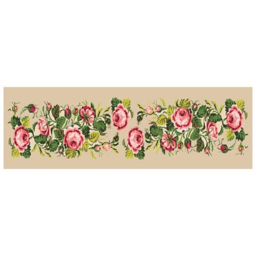 Σταμπωτή τραβέρσα με ρομαντικό μοτίβο ροζ τριαντάφυλλων, σχεδιασμένη σε εταμίν ύφασμα Κνωσσός μπεζ με χρυσό. Οι αποχρώσεις έχουν επιλεγεί ώστε να δίνουν βάθος και ελαφριά διαβάθμιση, προσφέροντας φυσικότητα στα πέταλα και αντίθεση με το ουδέτερο φόντο. Ιδανική για κέντημα με σταυροβελονιά και κομπλέν, ενώ η χρήση τρίκλωνης κλωστής DMC mouline ή cotton perle συμβάλλει σε καθαρό και ανθεκτικό αποτέλεσμα.