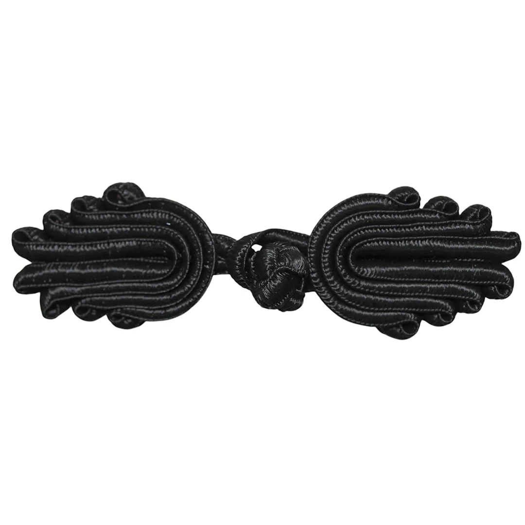 Κομψό μαύρο κούμπωμα μπροντερί από κορδόνι με κλασικό διακοσμητικό σχέδιο. Ιδανικό για παλτό, ζακέτες, φορέματα και χειροποίητες δημιουργίες, προσφέροντας ασφαλές κλείσιμο και ιδιαίτερη αισθητική στο τελικό αποτέλεσμα.