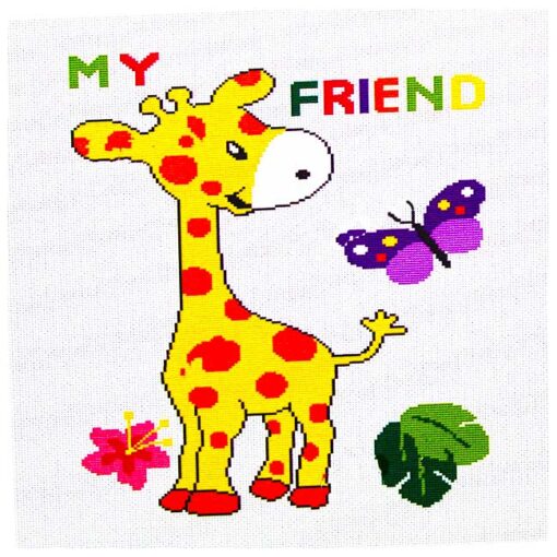 Χαρούμενη παιδική κουβέρτα με σταμπωτό σχέδιο σε βαμβακερό ύφασμα ψάθα, που απεικονίζει μια φιλική καμηλοπάρδαλη με πεταλούδα, φύλλα και λουλούδια, πλαισιωμένα από τη φράση “My Friend”. Ιδανική για σταυροβελονιά, ακόμα και για αρχάριους, προσφέρει δημιουργική απασχόληση και μπορεί να γίνει υπέροχο δώρο για μωρά και μικρά παιδιά. Κατάλληλη για καρότσι ή αγκαλιάς.