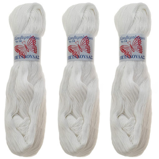 Το Κουβερτόνημα Πεταλούδας είναι ένα 100% βαμβακερό νήμα υψηλής ποιότητας, ιδανικό για πλέξιμο με βελονάκι και δημιουργία δαντελών. Διατίθεται σε λευκό χρώμα και σε τρία μεγέθη: Νο12, Νο14 και Νο16. Όσο μεγαλύτερος είναι ο αριθμός, τόσο πιο λεπτό είναι το νήμα. Το βάρος κάθε τεμαχίου είναι 125 γραμμάρια.