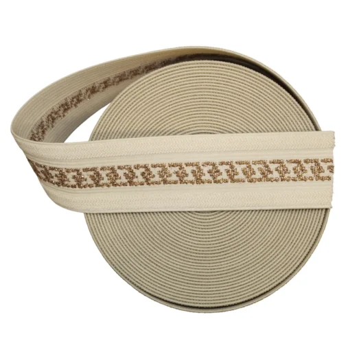 Κομψό λάστιχο ραπτικής σε εκρού απόχρωση με λεπτομέρεια χρυσοκλωστής. Συνδυάζει ελαστικότητα και αισθητική, ιδανικό για ζώνες, φούστες, φορέματα και διάφορες άλλες εφαρμογές.