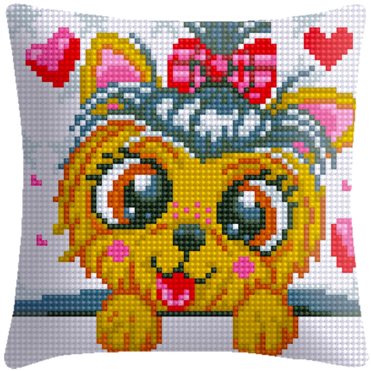 Μαξιλάρι κεντήματος με σχέδιο το χαριτωμένο γιορκσάιρ, διακοσμημένο με καρδούλες και έντονα χρώματα που χαρίζουν ζωντάνια και παιχνιδιάρικη διάθεση. Το σετ περιλαμβάνει σταμπαριστό καμβά υψηλής ποιότητας και όλα τα απαραίτητα υλικά, ώστε να δημιουργήσετε εύκολα το δικό σας μαξιλάρι. Ένα ιδανικό έργο για παιδιά και λάτρεις των κατοικίδιων, που θα δώσει μοναδικό στυλ στο χώρο σας.