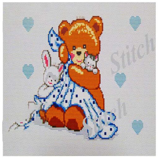 Παιδικό σταμπωτό μαξιλάρι για κέντημα, με χαριτωμένο σχέδιο ενός αρκουδιού που κρατά σφιχτά τη μπλε πουά κουβέρτα του, μαζί με το κουνελάκι και το γατάκι του. Οι γαλάζιες καρδιές στο φόντο προσθέτουν τρυφερότητα και χρώμα. Τυπωμένο σε βαμβακερό ύφασμα εταμίν ψάθα, είναι ιδανικό για σταυροβελονιά και εύκολο στη χρήση ακόμη και από αρχάριους. Μια υπέροχη επιλογή για δώρο ή διακόσμηση παιδικού χώρου.