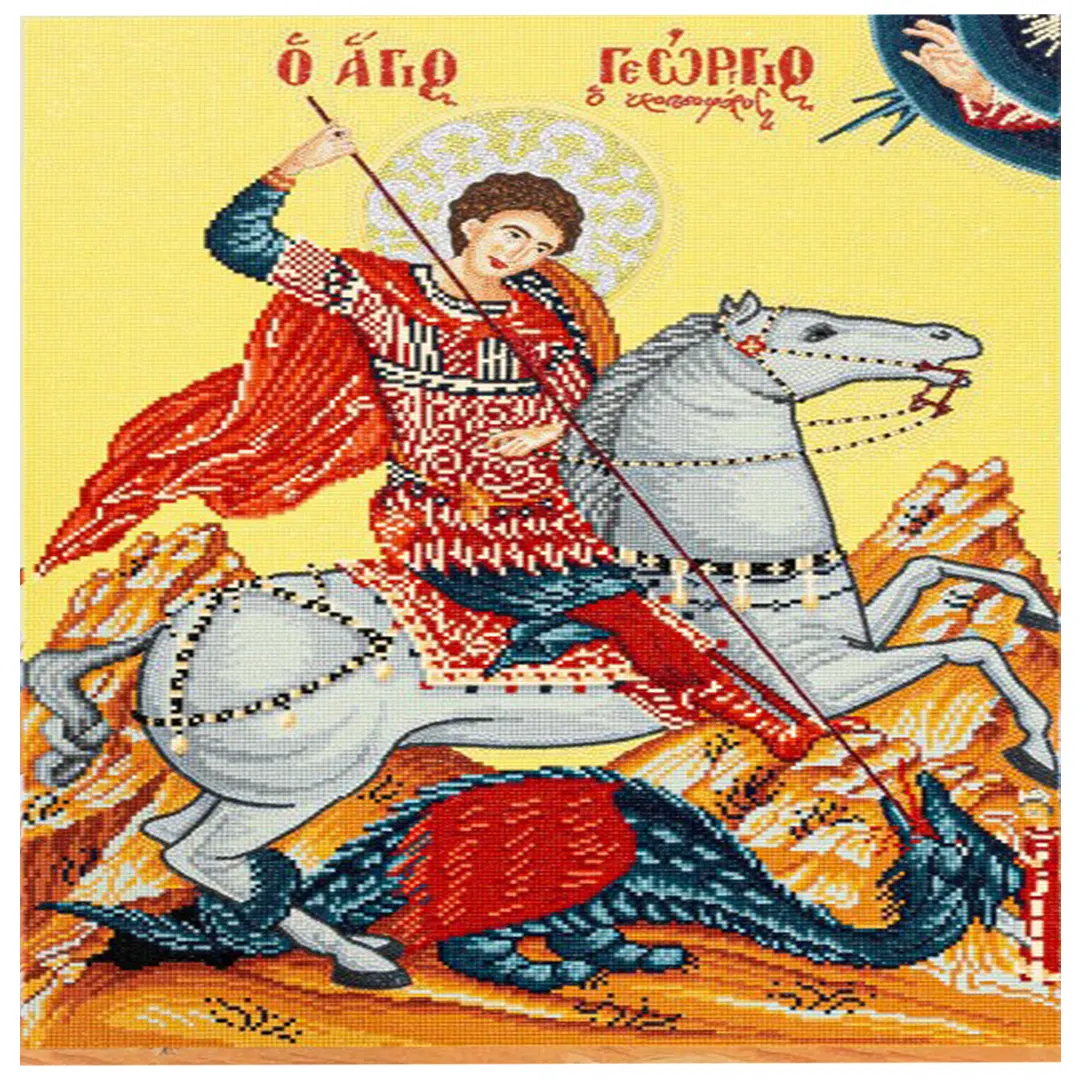 Πίνακας με Ψηφίδες Diamond Dotz Άγιος Γεώργιος ο Τροπαιοφόρος, ένα εντυπωσιακό θρησκευτικό έργο που απεικονίζει τον Άγιο καβάλα στο λευκό άλογο τη στιγμή που νικά τον δράκο, σε μια από τις πιο εμβληματικές παραστάσεις της ορθόδοξης αγιογραφίας. Η εικόνα ξεχωρίζει για τη δυναμική κίνηση, τα έντονα χρώματα και τη λαμπερή απόδοση των ψηφίδων, που αναδεικνύουν κάθε λεπτομέρεια της μορφής του Αγίου, της πανοπλίας και του φόντου.