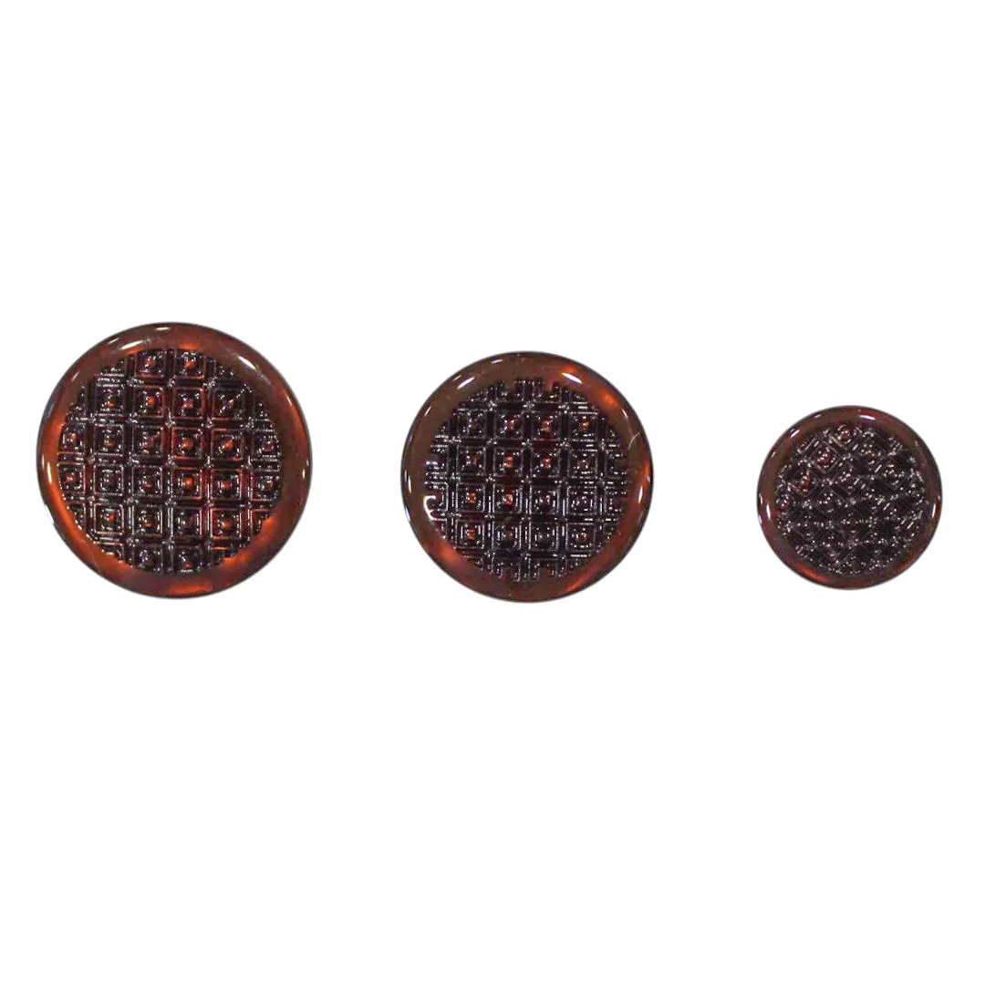 Διακοσμητικό στρογγυλό κουμπί με ανάγλυφο γεωμετρικό μοτίβο και γυαλιστερό τελείωμα, διαθέσιμο σε καφέ, μαύρο και μπλε. Ιδανικό για σακάκια, παλτό ζακέτες και άλλα.