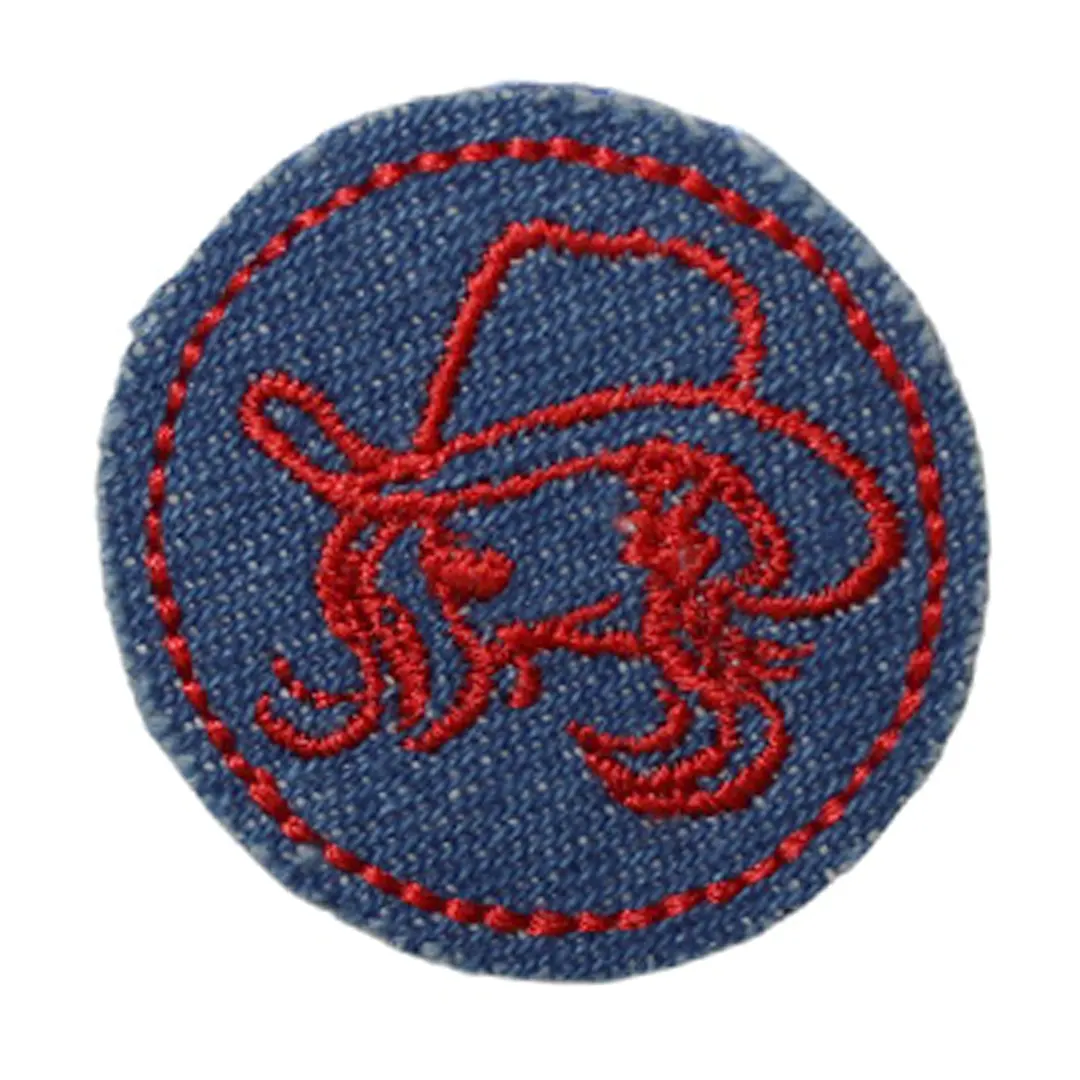 Στρογγυλή θερμοκολλητική στάμπα σε τζιν ύφασμα με σχέδιο κοπέλας που φοράει καουμπόικο καπέλο, ιδανική για διακόσμηση σε τζιν μπουφάν, τσάντες, παιδικά και νεανικά ρούχα.