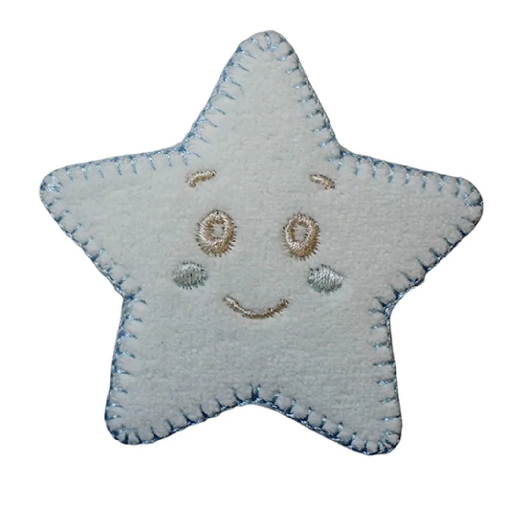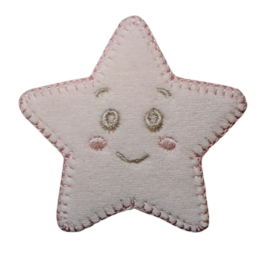 Θερμοκολλητικό διακοσμητικό μοτίφ με σχέδιο χαμογελαστό αστεράκι, σε απαλούς τόνους ροζ, γαλάζιου και λευκού, ιδανικό για τη διακόσμηση βρεφικής προίκας και παιδικών δημιουργιών.