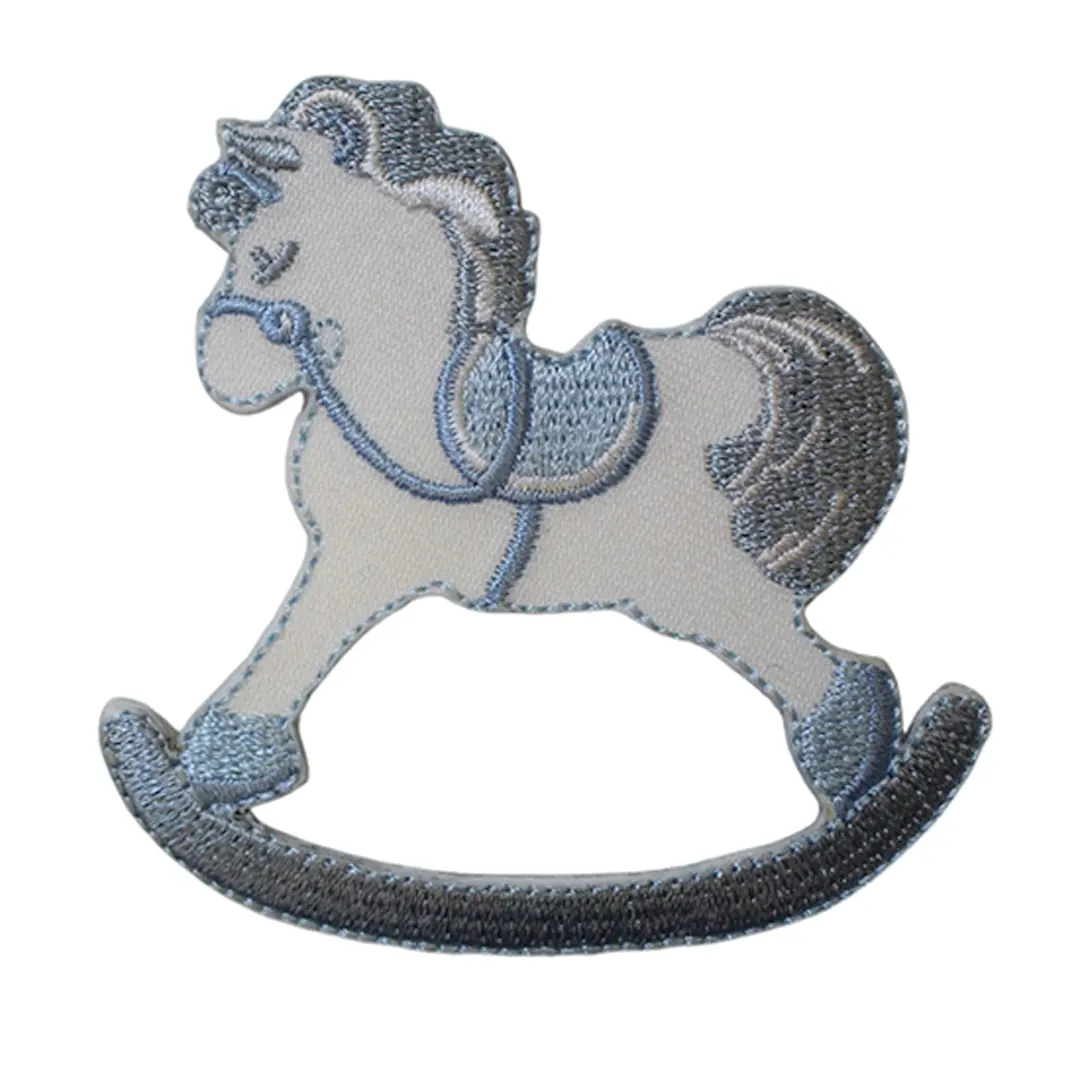Θερμοκολλητικό μοτίφ με σχέδιο κουνιστό αλογάκι σε απαλές ροζ και γαλάζιες αποχρώσεις, ιδανικό για διακόσμηση βρεφικής προίκας, ρούχων, σεντονιών, κουβερτών και χειροποίητων κατασκευών για μωρό.