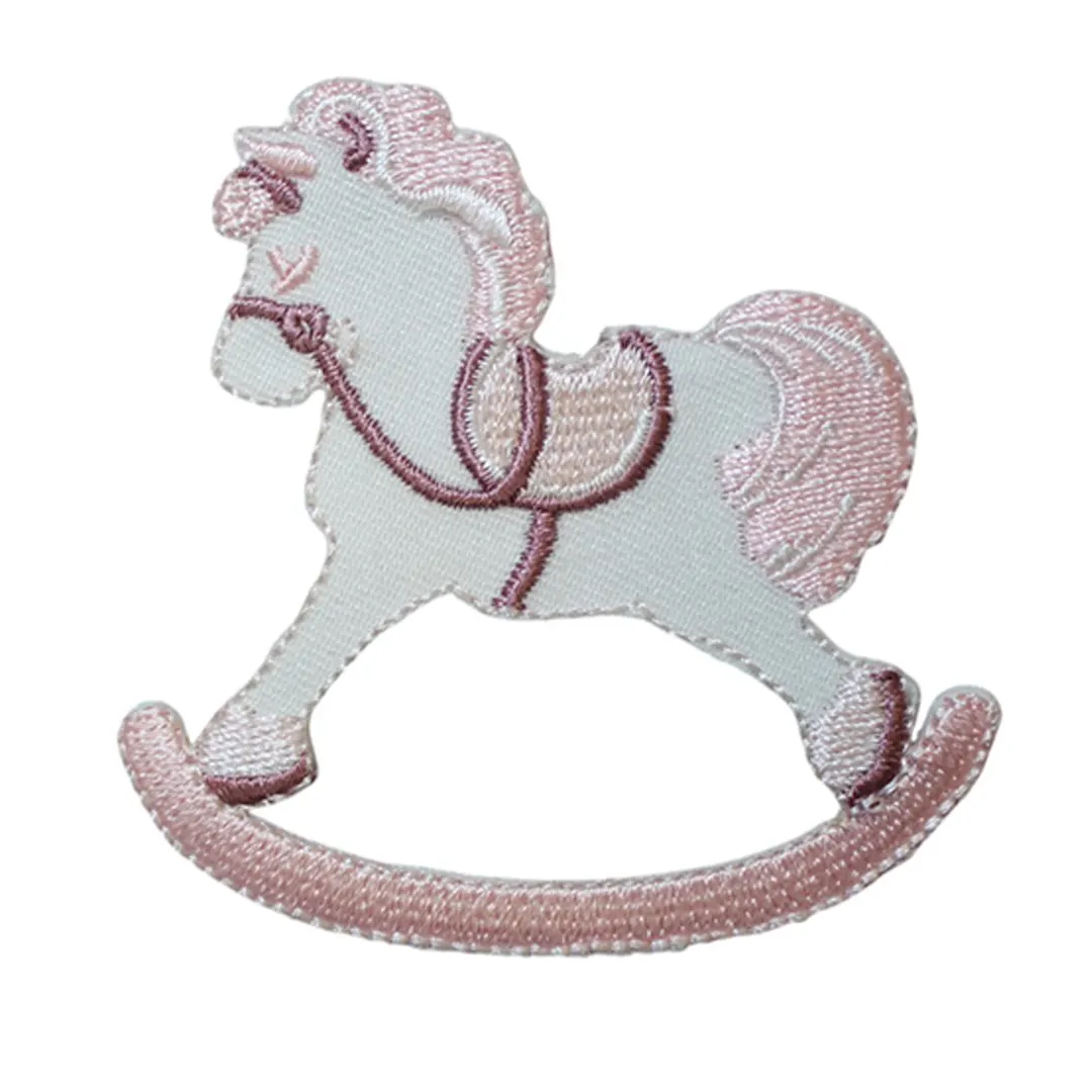 Θερμοκολλητικό διακοσμητικό μοτίφ με κεντημένο σχέδιο κουνιστό αλογάκι σε απαλούς τόνους ροζ και γαλάζιου, ιδανικό για βρεφική προίκα και διακόσμηση ειδών μωρού.