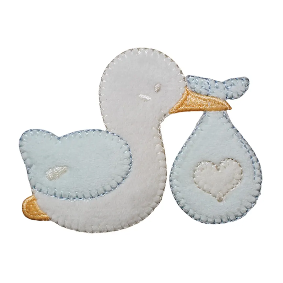 Θερμοκολλητικό διακοσμητικό μοτίφ με κεντημένο σχέδιο πελαργού που κρατά το μωρό στον σάκο, σε γλυκές αποχρώσεις γαλάζιου και ροζ, ιδανικό για τη διακόσμηση βρεφικής προίκας και ειδών μωρού.