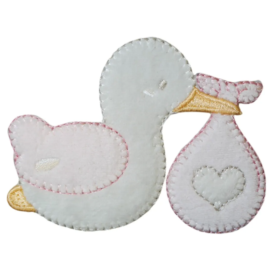 Θερμοκολλητικό μοτίφ με σχέδιο τον πελαργό που κρατά το μωρό στον σάκο, σε απαλές αποχρώσεις γαλάζιου και ροζ, ιδανικό για διακόσμηση βρεφικής προίκας, ρούχων και χειροποίητων ειδών για νεογέννητο.