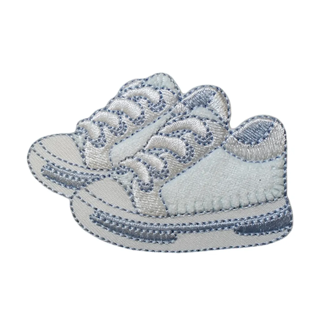 Θερμοκολλητικό διακοσμητικό μοτίφ με κεντημένο σχέδιο βρεφικά παπουτσάκια, σε γλυκές αποχρώσεις γαλάζιου, λευκού και ροζ, ιδανικό για τη διακόσμηση βρεφικής προίκας και ειδών μωρού.