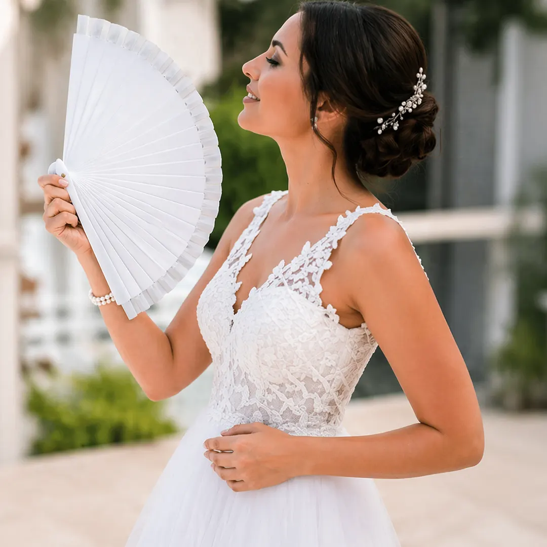 Η λευκή ξύλινη βεντάλια είναι ιδανικό αξεσουάρ της νύφης για στιγμές που χρειάζεται άνεση και κομψότητα, προσφέροντας δροσιά κατά τη διάρκεια της τελετής και της δεξίωσης. Κατάλληλη επιλογή για χρήση σε γάμους και εκδηλώσεις με υψηλές απαιτήσεις εμφάνισης.