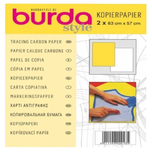 Το χαρτί αντιγραφής Burda είναι ιδανικό για την ακριβή μεταφορά πατρόν και σχεδίων σε υφάσματα. Κάθε συσκευασία περιλαμβάνει δύο φύλλα μεγάλου μεγέθους, ένα λευκό και ένα κίτρινο, με διαστάσεις 83cm x 57cm το καθένα. Η πίσω πλευρά των φύλλων διαθέτει μελάνι, επιτρέποντας την εύκολη αντιγραφή των σχεδίων σας.