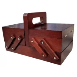 Κλασικό ξύλινο κουτί ραπτικής σε σκούρο καφέ χρώμα, με πτυσσόμενο μηχανισμό για εύκολη οργάνωση.
